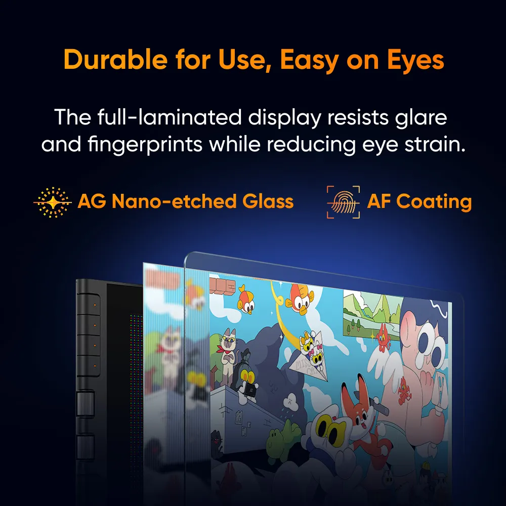 The full-laminated display is crafted with AG nano-etched glass and AF coating. It resists glare, scratches, fingerprints, and stains while reducing eye strain. You'll enjoy a true pen-on-paper precision with zero distractions.