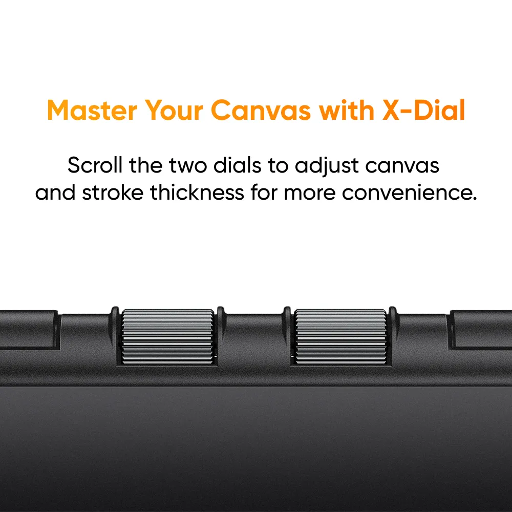 Take a close look at the brand-new X-Dial. This innovative design allows you to zoom in and out of the canvas or adjust the thickness of strokes, simply by scrolling the two dials—everything crafted for your convenience.